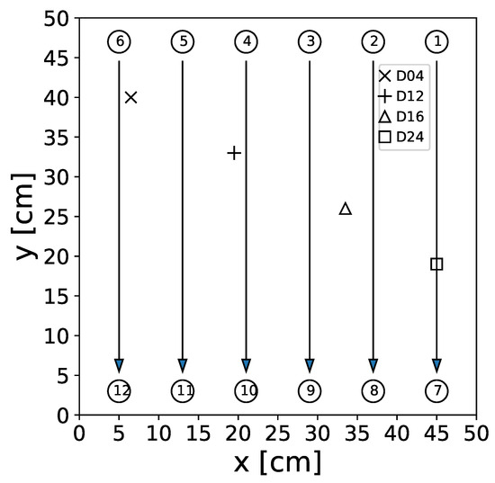 To facilitate the pitch–catch measurements, 12 DuraAct piezoelectric transducers were co-bonded to the plate, while four artificial damage locations were introduced at different positions on the surface to simulate damage [27]. These simulated damage consisted of circular aluminum disks, 1 cm in diameter, affixed to the CFRP plate using tacky tape. A schematic diagram illustrating the plate setup, including the considered transducer paths with actuator transducers and sensor transducers with , can be found in Figure 2.