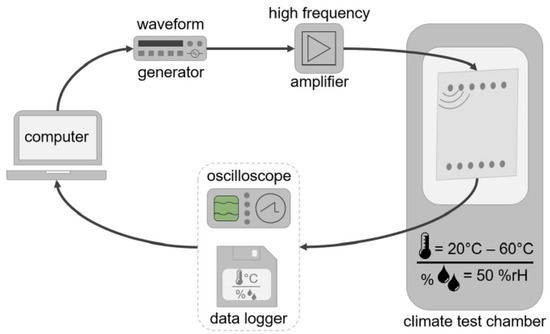 A sketch of the experimental setup is shown in Figure 3. In the picture, it is shown that the plate is placed in a climate chamber. A computer sets the waveform of the pitch signals and sends it to a waveform generator, which passes the signal to an amplifier. The amplifier sends the signal to the actuator. The sensor detects the UGW signal, which is recorded by an oscilloscope. The current temperature of the UGW measurement is recorded by a data logger. The UGW signal and temperature are then passed to the computer where the data is stored.