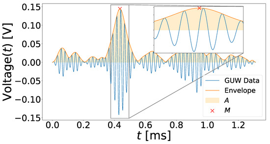 Finally, the maximum value of the data envelope, M, was determined. Figure 4 illustrates an example of a UGW signal with its corresponding envelope and the extracted maximum.