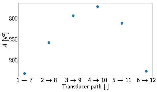 Average values of the area under the envelope for different transducer paths for the damage-free case.