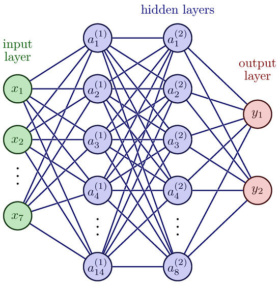 To showcase the effectiveness of using artificially generated data for training ANNs, a classic ANN architecture was utilized. The architecture consists of an input layer with seven nodes, one node for each computed input feature. This layer is followed by two hidden layers, each with 14 and 8 nodes, respectively, using the tangent hyperbolic function as the activation function. This function was used because it is non-linear and can be used to separate different classifications in a non-linear, separable space.
