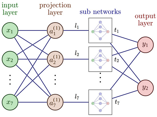 A sketch of the utilized Explainable Artificial Neural Network (XANN) architecture. The architecture consists of input nodes denoted as x, where , , …, and . The input layer is fully connected to a projection layer with linear activation. The outputs of the projection layer nodes are then fed into separate subnetworks, where each projection node contributes its output to a specific subnetwork. Finally, the outputs of the subnetworks are merged in the nodes and of the output layer.