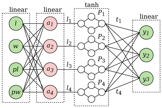- Output (class setosa) always uses one subnetwork (negative gradient , , positive gradient in experiments 1, 2, and 3, respectively);