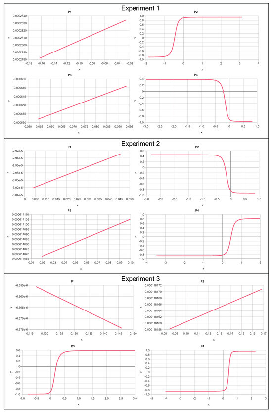 Subnetwork transfer functions from three independent experiments of the XANN for IRIS dataset classification (arb. units).