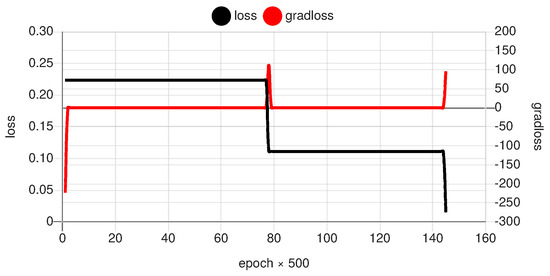 Example of the progress of the training with respect to the entire loss and the loss gradient (arb. units).
