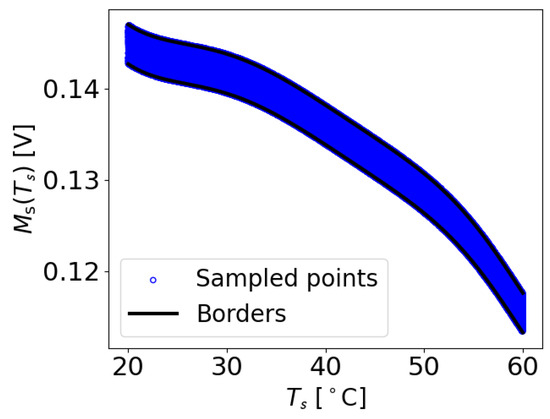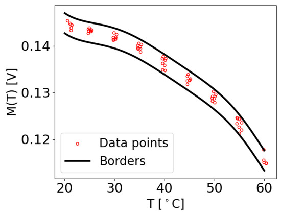 To calculate and , the initial values of the constants and were set to zero. Subsequently, each measurement at its corresponding temperature T was checked to determine if it fell within the range of and . If a value at temperature T was found to be smaller than , a very small value of was added to . Similarly, if a value at temperature T was larger than , the same small value of was added to . This iterative process continued until all the data points within the dataset adhered to the predefined boundaries. Therefore, and denote the maximum acceptable deviations of a value at a particular temperature T from the function , in order to be identified as damage-free. An example of the extracted M values with the determined borders for the damage-free case of transducer path is shown in Figure 5. It can be observed that all the M data points lie within the upper and lower boundaries.