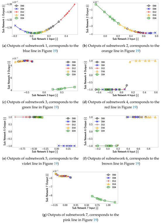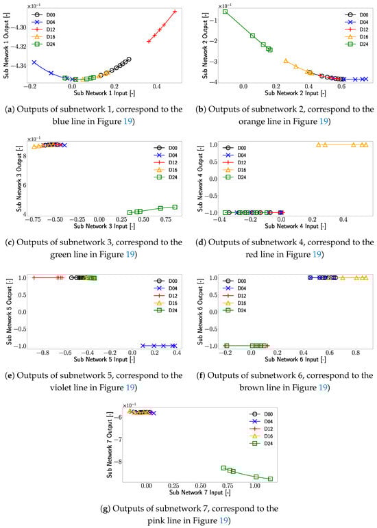 - Subnetwork 4 employs a shifted tangent hyperbolic function as its transfer function, leading to a distinct and abrupt separation of damage cases (Figure 20d);