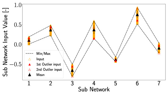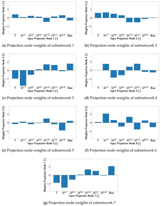 The architecture of the Explainable Artificial Neural Network (XANN) used in this study was taken from the work of J. Vaughan et al. [26]. The XANN architecture comprises an input layer, followed by a projection layer with a linear activation function. The projection layer is then connected to multiple subnetworks, where the number of subnetworks matches the number of nodes in the projection layer. Each node in the projection layer feeds its output to a separate subnetwork. All subnetworks have the same number of hidden layers and nodes and use the tangent hyperbolic function as the activation function (to cope with non-linear transfer functions, but any other activation function can be used). The outputs of the individual subnetworks are then merged in the output layer, which uses a linear activation function. The linear activation functions of the input, projection, and output layer are important to preserve the interpretability of the subnetwork transfer function, which should be the dominant function in the model. A sketch of such a XANN is displayed in Figure 8, while in Table 1, the number of weights and the activations for every layer are displayed. For a more detailed explanation of the theoretical background of the XANN architecture, please see [26].
