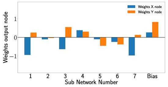In this work, the XANN architecture comprises seven input nodes and a projection layer with seven nodes. The subnetworks are constructed with three layers, consisting of one, four, and one nodes, respectively. The activation function employed in the subnetworks is the tangent hyperbolic function. The output layer consists of two nodes, allowing the prediction of the X- and Y-position of the damage (or values close to zero indicating there is no damage).