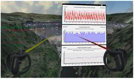 The positional and interaction data are transmitted between the VR device (headset and controllers) worn by the user and the management module. This module maps the user’s input to a corresponding interaction in the immersive environment, setting its position and orientation in the virtual world. Within the DamVR system, as users engage with the sensor networks and select individual sensors, the management module initiates a process to retrieve and interpret the relevant data from the database. These extracted data are subsequently visualized on the designated panels, primarily through charts depicting the measured values’ temporal progression. Further interaction with these panels, such as selecting a specific time frame on the charts, prompts the management module to adjust the temporal scope of the data. It achieves this by requesting a specific subset of data from the database corresponding to the selected time frame. This functionality ensures that the information presented to the user is contextually appropriate and temporally accurate.