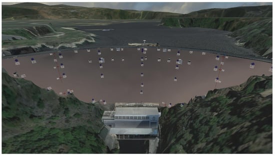 The virtual model of the Cabril Dam, our case study, was derived from a point cloud obtained through 3D scanning field campaigns conducted by LNEC. The acquired point cloud data underwent additional processing to eliminate noise, outliers, and artifacts, enhancing the data’s quality and accuracy. The next phase involved surface reconstruction. A mesh of the dam structure was generated through surface-based reconstruction methods [65]. The mesh underwent additional refinement to improve its quality, including smoothing, decimation, and hole filling. The next step entailed texture application to the 3D model. This texture was created from a photo mosaic, assembled using images captured by a multisensor laser scanner. The texture mapping process then involved assigning these photographic textures to the 3D object.