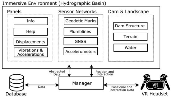 - A management module tasked with interpreting data from the database. This module also translates the positional data from the VR equipment into the immersive environment and ensures consistent synchronization between the dam models, the sensor networks, and the informational panels.