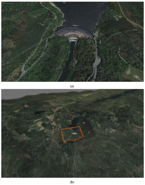 The representation of the Cabril Dam in DamVR (a) and an overview of the large-scale terrain surrounding the dam (highlighted in orange is the immediate area of the Cabril Dam) (b).