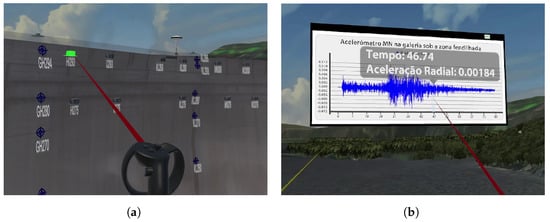 Selection within the immersive environment is carried out using raycasting [64]. This technique is materialized with the projection of visible beams from the VR controllers. Users can direct these beams towards the interface components they wish to select and engage with. For instance, in the context of teleportation, users can aim the beam emanating from the right controller to a desired location within the model to initiate their transport to that position. The user interface within DamVR consists of several key elements: the model of the dam and its surroundings, the sensor networks, floating informational panels, and idiom panels. A comprehensive description of these interface components is presented below.