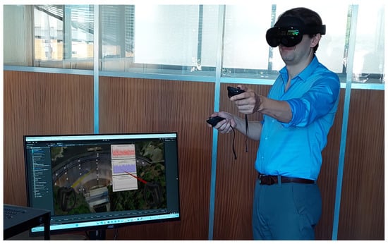 The prototype was evaluated through a user study with 22 participants from whom informed consent was obtained. This study aimed to assess the system’s performance. With that objective, domain experts tested the prototype by carrying out a set of predefined tasks (Figure 7). They were requested to complete a feedback questionnaire assessing the prototype’s usability and usefulness characteristics. During the test sessions, quantitative and qualitative data were recorded. The results were analyzed and compared with the ones obtained in an existing study pertaining to an AR tool, DamAR, with similar functionalities [16,17]. This existing tool uses mobile touch devices (like smartphones and tablets) to display on-site using screen-based visualization, sensor data superimposed on the dam. DamAR represents an immediate situated approach as it uses the physical referent. In opposition, DamVR represents a proxied situated approach as it uses a representation of the physical referent. The methodology adopted for the evaluation also matched the one used by Verdelho Trindade et al. in the existing study.