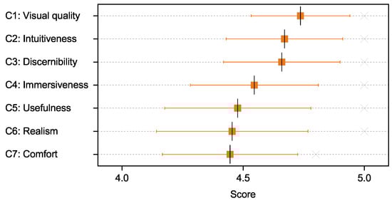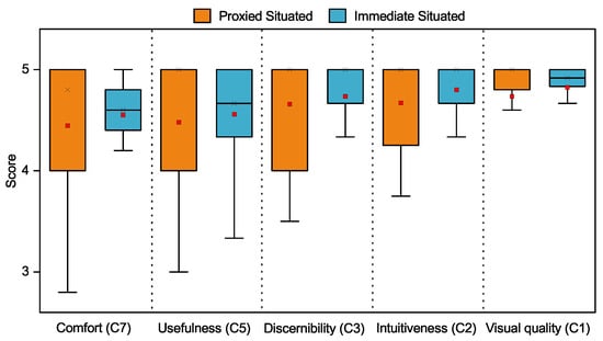 Given that the experimental samples had no statistically significant differences, we wanted to compare the proxied situated/VR and immediate situated/screen-based visualization approaches in relevant aspects of user experience. With that objective, five of the previously defined categories were addressed: C1, C2, C3, C5, and C7. ‘Immersiveness’ and ‘realism’ (C4, C6) were left out of the comparison because of their lack of relevancy in the scope of the immediate situated/screen-based visualization approach. In addition to the scores obtained with the proxied situated approach (shown above), the results obtained for each relevant category with the immediate situated approach (M (SE); Mdn (IQR)) were: comfort (4.59 (0.016); 4.60 (0.40)), usefulness (4.60 (0.019); 4.67 (0.67)), intuitiveness (4.82 (0.013); 5.00 (0.33)), discernibility (4.76 (0.018); 5.00 (0.33)), and visual quality (4.84 (0.012); 5.00 (0.17)). The results show similar scores in both reality/situatedness modalities, with a marginally but consistently higher score for the immediate situated/screen-based visualization approach across the considered categories (Figure 9). To understand the statistical significance of category score differences between prototypes, Wilcoxon Signed-Rank tests were carried out, with a prior assessment of the distribution non-normality (using a Shapiro–Wilk test). The results offer no evidence against the supposition of no statistically significant difference between the sets of category scores (C1: p = 0.434 (W = 59.5); C2: p = 0.534 (W = 55.5); C3: p = 0.503 (W = 30.0); C5: p = 0.413 (W = 39.0); C7: p = 0.509 (W = 41.5)).