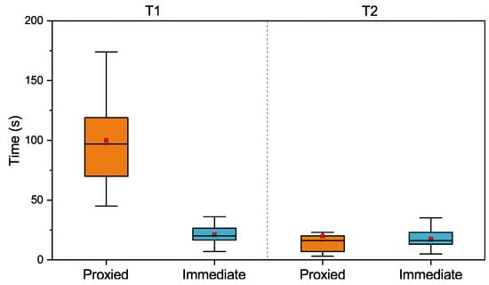 Comparison between the time participants took to complete T1 and T2 both with the proxied situated/VR and immediate situated/screen-based visualization prototypes.