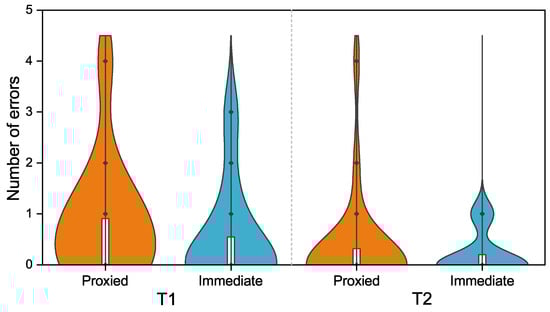 Concerning the number of errors made by the participants, T1 had a higher number of errors than T2. Less than half (48%) of the participants completed T1 without making any mistakes. In contrast, 95% of the participants completed T2 without any errors. Furthermore, 42% of the participants completed both tasks without making mistakes. The comparison of the registered number of errors with the previous immediate situated/screen-based visualization study (Figure 11) shows a higher number of errors for the proxied situated study for both tasks.