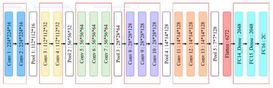 One of the most popular deep learning models specialized in image classification is VGG16. VGG16 is divided into two parts as shown in the Figure 4. The first section is a convolutional section and the second section is a dense section. The convolutional section consists of thirteen convolutional layers and five max-pooling layers. The dense section consists of three fully connected dense layers. The simple architecture of the VGG16 gives it the ability to produce outputs quickly, which is important for forest fire detection [20].
