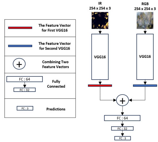 The proposed model for fire detection belongs to the intermediate fusion method of homogeneous parts and is called Intermediate Fusion VGG16. The early detection model comprises two VGG16 models, with the first VGG16 receiving an IR image as input and the second VGG16 receiving an RGB image as input. Two feature vectors are created after the inputs are fed to the two VGG16 models. Those vectors are merged to have a single vector and then fed into a fully connected network with 64 neurons and RELU activation function. The output is fed into a fully connected network with 32 neurons and a RELU activation function. In the final layer, the output is fed in a fully connected layer with three neurons and a SOFTMAX activation function to obtain the predictions. Figure 5 depicts the model architecture of detecting forest fire that is used in the Forest Defender Fusion system.