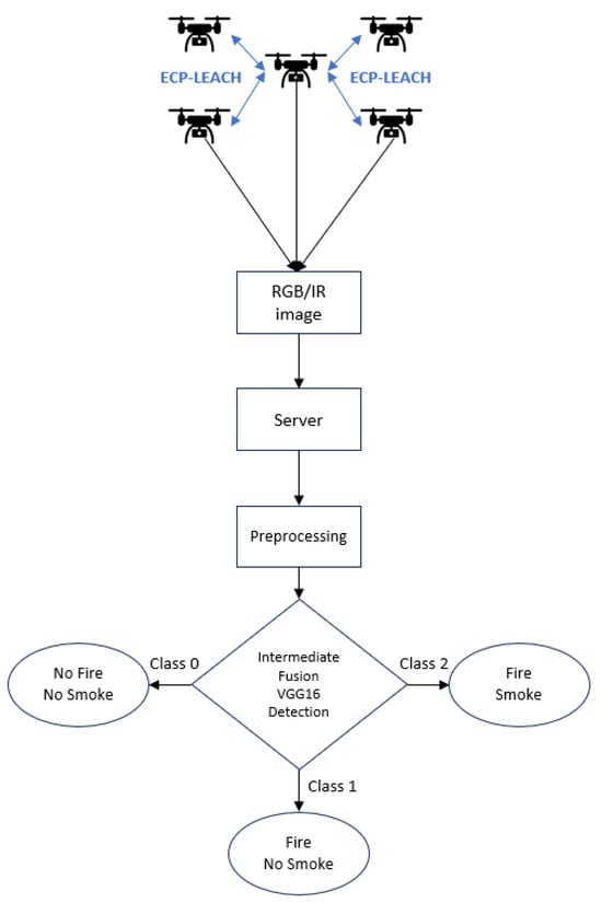 The drones are a valuable addition to the system due to their distinctive capabilities. The ECP-LEACH protocol allows drones to be used over a longer period of time and thus to further monitor the area in order to detect forest fires. The ECP-LEACH protocol puts the drone into sleep mode by the threshold monitoring unit. The drones transmit RGB images and IR images continuously to the base station based on the schedule specified by the ECP-LEACH protocol. The base station receives the images and sends them to the cloud, which in turn sends them to the server. The server has an Intermediate Fusion VGG16 model that is able to determine whether or not there is a forest fire. When the images arrive at the server, they enter the Intermediate Fusion VGG16 network to detect the existence of a forest fire. Each image (RGB and IR) is entered into the VGG16 model to form two feature vectors. The two vectors are combined to make an accurate decision about the situation. The system can issue alerts to the concerned authorities to inform them of the presence of a forest fire in the area of the drone sending the images to quickly extinguish the forest fire. Figure 6 shows the flowchart of the Forest Defender Fusion system.
