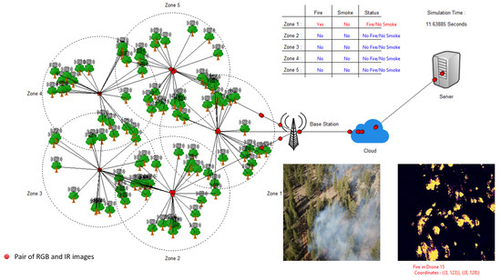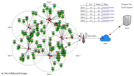 To demonstrate the Forest Defender Fusion system, a simulation was performed using Python version 3.11.4. The simulation consists of 100 drones that communicate with each other using the ECP-LEACH protocol. These drones are distributed in five zones within an area of 2000 m × 2000 m. The drones continuously send RGB and IR images to the base station. Then, the base station sends the images to the cloud which in turn transmits them to the server that contains the Intermediate Fusion VGG16 model. When the images arrive at the server, they are pre-processed and then the decision is made by the Intermediate Fusion VGG16. In Table 3, the simulation parameters are presented.
