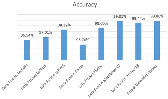 The results displayed in Figure 10 highlight the comparisons between the Forest Defender Fusion System and Fusion methods by Chen, X [11] in an accuracy metric. The Forest Defender Fusion System performs with 99.86% accuracy. The accuracy values shown by the Early Fusion Logistic (96.54%), Early Fusion LeNet5 (97.01%), and Early Fusion Flame (95.7%) models indicate the value of merging data early in the network. The Late Fusion Flame (98.60%), Late Fusion LeNet5 (98.32%), and Late Fusion ResNet18 (99.44%) models highlight the benefits of integrating information at later stages by improving accuracy even more. The improved performance of Late Fusion MobileNetV2 (99.81%) over its competitors highlights the importance of MobileNetV2’s architecture in obtaining better results. The proposed Forest Defender Fusion System outperforms all other models. This highlights the value of the VGG16 design in conjunction with intermediate fusion methods which offer a very precise solution for early detection systems in the monitoring of forest fires.