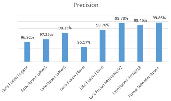 The Forest Defender Fusion System stands out among the assessed models with a precision of 99.86% as shown in Figure 11. This indicates that the system performs well in accurately detecting positives, which demonstrates its effectiveness in detecting forest fires. Late Fusion MobileNetV2 stands out as the closest competitor to the proposed system as it obtained a precision of 99.78%. The rest of the algorithms obtained 96.92%, 97.35%, 98.35%, 96.17%, 98.76%, and 99.46% for Early Fusion Logistic, Early Fusion LeNet5, Late Fusion LeNet5, Early Fusion Flame, Late Fusion Flame, and Late Fusion ResNet18, respectively. Interestingly, the late fusion techniques are able to consistently produce improved precision in various designs, indicating that they are useful for improving positive prediction accuracy. The Forest Defender Fusion System’s precision highlights the importance of this system in producing better outcomes and supports its potential for detecting forest fires.