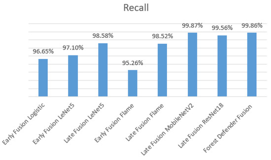 The Forest Defender Fusion System demonstrates commendable performance with a recall value of 99.86% as shown in Figure 12. This signifies the system’s proficiency in accurately identifying and retrieving relevant instances. The Forest Defender Fusion System outperforms the rest of the models except Late Fusion MobileNetV2, where it obtained a recall of 99.87% while the rest of the algorithms obtained 96.65%, 97.10%, 98.58%, 95.26%, 98.52%, and 99.56% for Early Fusion Logistic, Early Fusion LeNet5, Late Fusion LeNet5, Early Fusion Flame, Late Fusion Flame, and Late Fusion ResNet18, respectively.