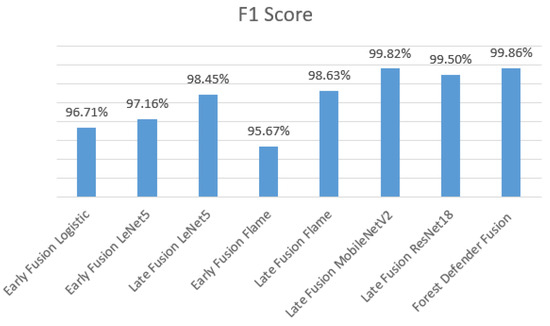 Figure 13 displays the performance of different models according to their F1 scores. With an F1 score of 99.86%, the Forest Defender Fusion System was successful. This result demonstrates how well the system works to detect forest fires. Notably, high F1 scores of 99.82% and 99.50% are shown by the Late Fusion MobileNetV2 and Late Fusion ResNet18 models, respectively, demonstrating their proficiency in detecting forest fires. The rest of the models obtained 96.71%, 97.16%, 98.45%, 95.67%, and 98.63% for Early Fusion Logistic, Early Fusion LeNet5, Late Fusion LeNet5, Early Fusion Flame, and Late Fusion Flame, respectively. These results collectively emphasize the strong performance of the Forest Defender Fusion System and its potential for detecting forest fires.