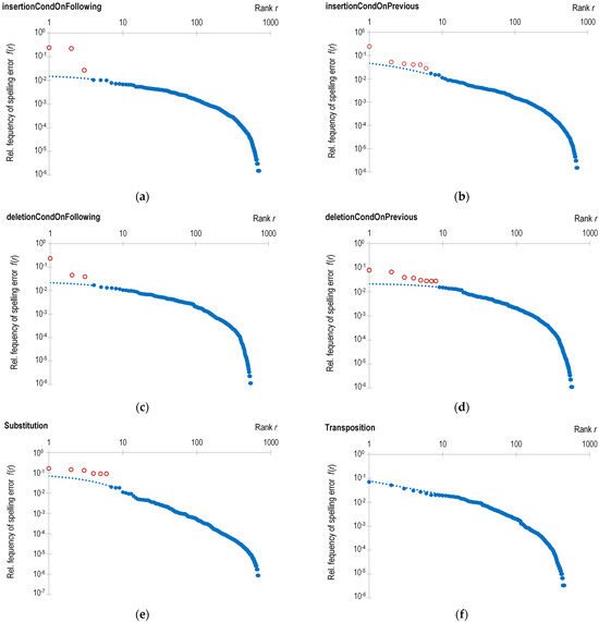 As can be seen from Figure 2a–e, the points corresponding to the higher ranks are distributed as if forming a smooth and regular curve, while for lower ranks, the values of the points may deviate significantly upwards from the supposed curve. However, in the case of a transposition spelling error, as shown in Figure 2f, points of a lower rank do not have a specified observed deviation. This fact confirms that transposition errors are random in nature.