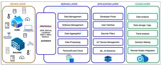 To improve the responsiveness and correctness of the BACS and BMS, edge intelligence and devices have been proposed. They push processing for data-intensive, advanced control and monitoring functions away from the field-level nodes to a new edge network level, effectively handle local workloads, and make faster, more precise service decisions. Therefore, in the concept of smart home and smart building, one of the solutions turned out to be the expansion of BACS and BMS network structures with new SoC edge modules. They communicate with field-level nodes to collect data from sensors or provide signals to actuators, and, at the same time, they are responsible for handling higher-level data communication and local processing of advanced algorithms for monitoring, data acquisition, and control functions. Moreover, these edge modules, thanks to routing support and the inclusion in the TCP/IP network, also allow communication of smart-home and smart-building modules with external cloud services (databases, data analytics and visualization, cooperation with machine learning—ML, artificial intelligence—AI tools, and advanced algorithms). In this way, the IoT potential increases and introduces other development possibilities for BACS and BMS. Since the IoT edge nodes can increase computation near the source of the data, various IoT and cloud services can be deployed on local systems. This paradigm is known as ‘edge computing’ and integrates IoT technologies and cloud computing systems [,]. What is very important in smart home and building applications is that it reduces the communication bandwidth needed between sensors, actuators, and the external data center. Moreover, it allows for easier integration of different subsystems (energy, climate control, security, comfort, user services, maintenance, and energy management) controlled and monitored in modern, fully integrated intelligent facilities [,,]. Therefore, this is one of the most important elements that should be included in the concept of a generic IoT framework for smart-building solutions.