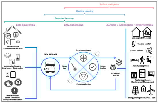 The development of modern techniques for collecting and processing big data has allowed for the effective implementation and use of ML and AI mechanisms, in particular supporting the organization and functioning operation of automation systems. According to Djenouri et al. [], in the context of BACS and BMS, ML techniques could be used to solve fundamental problems, such as predicting occupant behavior and preferences and forecasting energy demand and peak periods, which are difficult to solve with traditional programming, but potential solutions can be achieved from advanced and fast data analyses. They reviewed several research and studies and discussed potential areas for ML applications in two aforementioned categories:
