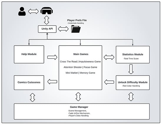 The presented diagram (Figure 2) encapsulates the interactive relationship among various elements designed to create a comprehensive VR experience. At the start, a representation of a user is shown, symbolized by a “person” icon, which directly connects to a VR headset, specifically “Quest 2”. This headset interacts bidirectionally with Unity API. Unity API serves as a central hub in this system, as it facilitates interactions across multiple modules. One key module is the “Player prefs file”, which manages user credentials, primarily handling the username. From Unity API [,], there is a direct interaction with several game and support modules. The “Helping Module” directs users to a suite of main games: “Cross the Road” (targeting impulsiveness), “Attention Shooter” (designed for focus and attention training), and “Mini Market” (tailored for memory enhancement). These games’ performance metrics are integrated into the “Statistics Module”, where data like the total time and scores are stored. Based on performance, specifically, if a player finishes the easy mode in less than four minutes, they unlock an achievement represented by the “Red Dog Collar”. This achievement is an actual interactable 3D object model that the player can place on Luna in order to be able to experience a more challenging version of the ADHD Dog game. Lastly, overarching all of these modules is the “Game Manager”, which seamlessly integrates and manages all components for an immersive experience, such as scene management, fade in/out mechanism, and the player’s data handling.