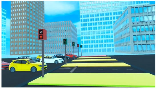 The player must navigate five traffic light crossings in the first task (Figure 3). Each traffic light begins at a random number within a certain range, decreasing every second. This change causes the traffic light to switch from green to red or vice versa when it reaches zero. The player must control their impulsiveness; if they cross the road on red, they move one crossing back from where they were and hear an error sound. This provides real-time feedback, instructing the player to comply with the game’s rules to complete it.