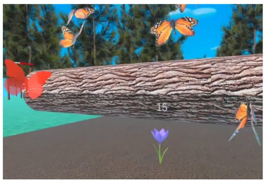 In the second activity, the player must focus on particular moving objects in space, butterflies, which are trying to hide a flower from the player while the player tries to cut it (Figure 4). The butterflies come in two varieties: regular butterflies and red butterflies. Their lives diminish while the player concentrates on them, and the red butterflies require more concentration time to defeat. The player must continuously avoid the butterflies until the timer ends.
