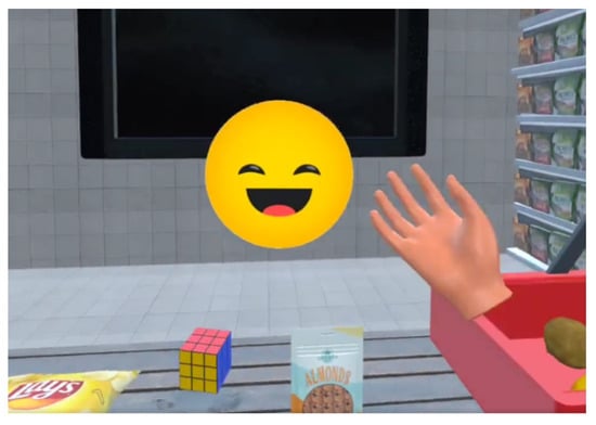 The third and final activity finds Luna entering an area of a local convenience store where, as indicated, only staff are allowed (Figure 5). The player agrees to take the cashier’s place until they find her and brings her back to the owner. This activity is designed to practice short-term memory as it presents the player with four random items that can be found in a memory market on the store’s main screen, which the player must retain in memory within a given time in order to obtain them and place them in the shopping cart. Consequently, when the player makes a correct decision about an item, a random face displaying a positive emotion, such as happiness or excitement, is shown as positive feedback. Conversely, when the decision is incorrect, a random face expressing a negative emotion, such as sadness, anger, or frustration, appears. This final challenge tests the player’s memory and encourages them to practice retaining and recalling information accurately.