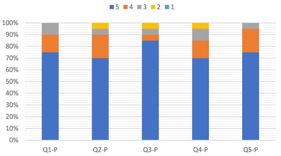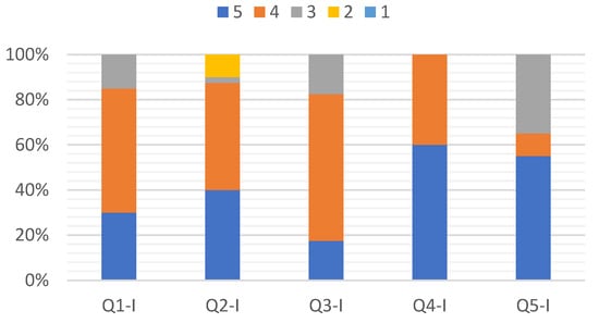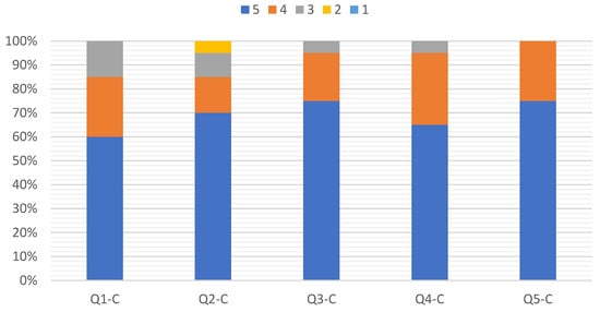 The examination of the results from the computer science expert perspective (G3) sheds light on critical aspects of ADHD Dog’s technological features, as shown in Figure 8. Responding to the extent of effectiveness and user-friendliness of the virtual reality aspects (Q1-C), the computer science experts recognized the significance of these elements in promoting engagement and interaction. The evaluation of the gamification elements (Q2-C) showcased positive ratings, emphasizing their role in enhancing user engagement. In their professional opinion regarding the leveraging of technological advancements (Q3-C), the experts acknowledged ADHD Dog’s success in creating an immersive and effective experience, attesting to its alignment with contemporary technological standards. Considerations of scalability and adaptability (Q4-C) yielded a confident outlook, indicating that the technological components are applicable to a broader audience. The assessment of the technological components’ contribution to a positive user experience (Q5-C) encompassed factors such as accessibility, responsiveness, and overall usability, revealing an overall positive reception among the computer science experts. These findings collectively underscore the effectiveness of ADHD Dog in leveraging technological principles to create a robust, engaging, and user-friendly virtual reality intervention.