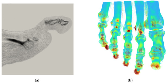Slice and DVR Foot Dataset Renderings. (a) A sagittal slice image of the Foot dataset. (b) A DVR of the toe area of the Foot dataset using Gaussian curvature-based transfer functions for colour and a cool-to-warm colourmap.