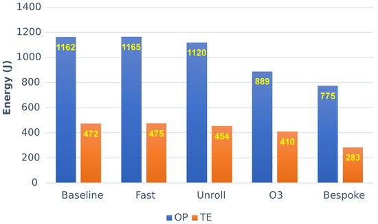 - Seng, J.S.; Tullsen, D.M. The Effect of Compiler Optimizations on Pentium 4 Power Consumption. In Proceedings of the Seventh Workshop on Interaction between Compilers and Computer Architectures, Anaheim, CA, USA, 8 February 2003; IEEE: Piscataway, NJ, USA, 2003; pp. 51–56. [Google Scholar]