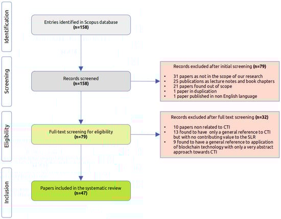 Taking into consideration that the research in the field of CTI and blockchain has grown during recent years, the objective of the present review is to present a comprehensive and systematic bibliographic review of related work that was published in the last five years and, if possible, identify the areas and potential trends that show increased research interest.