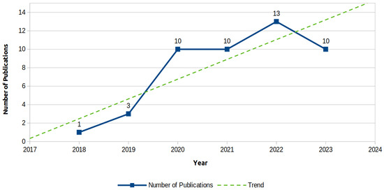 As a result, from the evaluation process, 47 research publications were found to be ultimately accepted for further analysis in the present systematic literature review. The source selection process is shown schematically in Figure 2. Furthermore, the yearly distribution of the finally included research papers in our systematic review is depicted in Figure 3, where it is shown that from 2018 onwards, there is an increasing trend in relevant research publications.