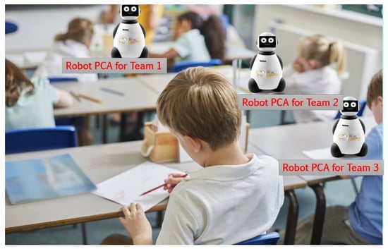 The scenario indicated to the participants was a primary education classroom with 25 children paired in 2–4 groups. Each row of the classrooms had one PCA, as shown in Figure 9. The PCA can work in “teacher mode” to create new activities or in “student mode” to show the activities, so that students can start learning how to program. The teacher can have either a tablet or a digital whiteboard to create the activities and see the progress of the students. The advantage of a digital whiteboard is that teachers could show how to solve an activity to all the students in case all, or a significant part, of them have doubts and do not know how to continue interacting with the PCA.