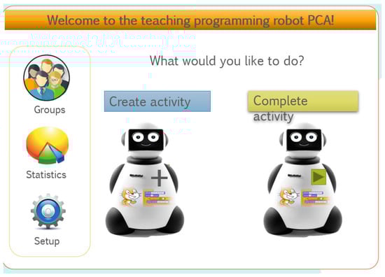 The answer to RQ2—“How pre-service teachers would like the PCA to teach programming in primary education?”—is that it should be intuitive, friendly, easy to use, and pay attention to diversity. Help should be provided both in the PCAs with tutorials and templates, but also with documents serving as a guide for the teachers prone to the use of PCAs. Teachers should have the possibility of creating activities for groups, managing statistics, and configuring options. Students should complete activities and fill in forms following a dialogue metaphor, in which each group is represented by an image. In general, there are some recommendations for researchers and/or teachers that would like to integrate the use of robot PCAs for teaching programming in classrooms: