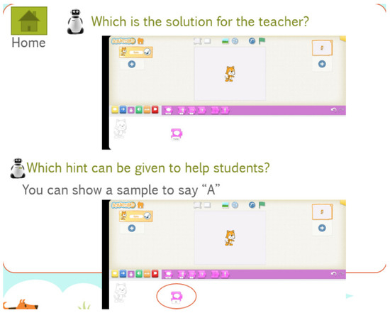 For each activity, teachers must choose the programming language (Scratch Jr or Scratch) according to the age of the students. Then, they must indicate the concepts to be learned: inputs/outputs, conditionals, or loops; the statement of the question, and some possible solution (Figure 14); the level of the difficulty; and if there is any element to deal with diversity. Once the teacher fills in the activity, any team can interact with the bot, as shown in Figure 15. In this case, the team does not know how to program the activity, and thus the PCA provides them with a sample which allows them to perform and solve the activity.