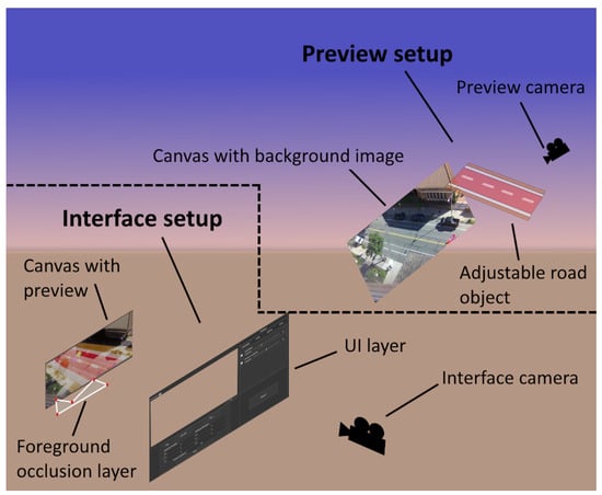 To extend the work done in the reactive synthetic data augmentation paper [20], we focus on the traffic-anomaly detection context. This context is much more challenging [2,15], as it focuses on traffic flow, pedestrians, and other participants in traffic such as cyclists and bikers. We built the application in Unity, and as a basis, used the Street Scene dataset [2]. We also used the open-source camera matching application fSpy [38] for semiautomatic camera calibration from a single image. This software was successfully used for augmenting surveillance images [20] and digital reconstructions [39]. The main parts of the developed application, as presented in Figure 1, are the user interface (Section 3.2), the synthetic object placement (Section 3.3), the occlusion of synthetic objects by real background elements (Section 3.4), the automatic annotation of normal and abnormal images (Section 3.5), and the improved blending of the real and synthetic parts of the image through lighting and shadows (Section 3.6). We will discuss each of these elements in the next subsections. As each of the elements is in a prototype stage, we will discuss the required changes to the prototype in the Future Work Section 6.