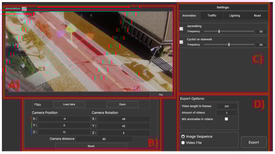 The proposed application’s main goal is to make synthetic data generation more straightforward for nonspecialist users. Because of this, the goal of the design of the interface was to keep the layout simple while still giving the user the freedom to make the simulation fit their footage. This can be a challenge, as giving the user more freedom will inherently lead to a need for more input fields [40,41]. From the design of interfaces for games [36], a set of heuristics can be used as a basis for building the program UI. The main design patterns used as a basis for the interface are that controls need to be consistent and use standard industry conventions, they are spread out and mapped naturally, and the controls are basic enough to not need a manual and be useable for both novice and experienced users. As the main user group is researchers working with deep learning and computer vision, it is believed that these users are used to interfaces closer to those of annotation software solutions such as LabelMe 5.4.1 [42], CVAT 2.11 [43], LabelImg [44], Supervisely 6.73 [45], and VoTT [46], among others. Similarly, to these applications, the visualization screen is given the largest screen space while the different menus for camera transformation, anomaly generation, traffic, lighting, exporting, etc. are set up as tabs, so less space is used, and unneeded information is hidden. In the final iteration, the UI is separated into four main groups shown in Figure 3: