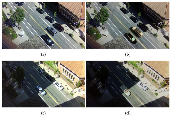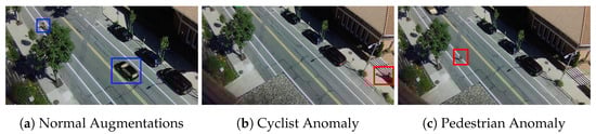 For generating anomalies, we selected two of the anomalies presented in Street Scene [2]—jaywalkers and cyclists not riding in the cyclist lane. We chose these two because they use represent normal-behaving objects that change to anomalies when placed in different parts of the captured scene. Additional anomalies such as illegal car U-turns, illegal parking, or even collisions can be easily added to the application. The position and the movement direction of normal and anomaly objects are randomized. Constraints are given to the movement of each of the three types of synthetic objects. The cars are always driving parallel to the road, and their direction is set so they drive in the correct traffic direction. Cyclists also always ride parallel on the road and bicycle paths. Their direction can be in the correct or inverse traffic direction. Driving in the wrong traffic direction is set as an extension of the cyclist anomaly. Finally, the pedestrians can move parallel on the walkway, or when jaywalking, they can cross the road and bike lane at different angles. Examples of augmented normal and abnormal scenes are given in Figure 6.