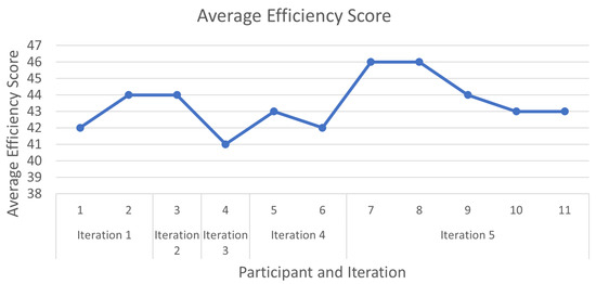 The average efficiency score calculated from the questionnaire given to each participant in the RITE. The score is the sum of the selected responses where extremely difficult is 1 and extremely easy is 5. The maximum possible score is 50 from 10 tasks.