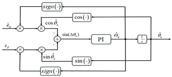 In Figure 3, the phase-locked loop structure differs from a conventional phase-locked loop by incorporating the signum function. The purpose of introducing the signum function is to evaluate the angular velocity, thereby determining the direction of rotation of the motor.